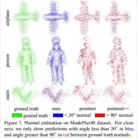 ModelNet40 上的法向预测结果如图 7 所示。与 PointNet 以及 PointNet++相比,RS-CNN 可以取得更加准确的法向预测结果。尽管如此,RS-CNN 仍然难以有效推理棘手的形状,比如旋转楼梯以及错综复杂的植物。