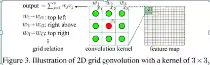 图 3 为经典 2D 网格卷积的示意图。注意到 wj 总是隐含着 xi 和 xj 的一个固定位置关系,也就是说,wj 在学习过程中受到了限制,实际上编码了一种规则的网格关系。因此,我们所提出的关系卷积方法具有通用性,它也能够建模经典的 2D 栅格卷积。