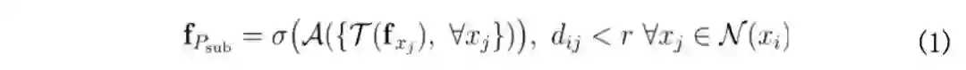 其中 x 是三维点,f 是特征向量,dij 是点 xi 和 xj 的 3D 欧式距离,r 是球半径。卷积结果 f Psub 通过首先使用函数 τ 对邻域中每一个点进行特征变换,然后使用函数 A 聚集变换后的特征,最后经过非线性 σ 激活后获得。注意到仅当 A 是对称函数,并且函数 τ 对邻域中每一个点均共享参数时,f Psub 对输入点的顺序具有置换不变性。