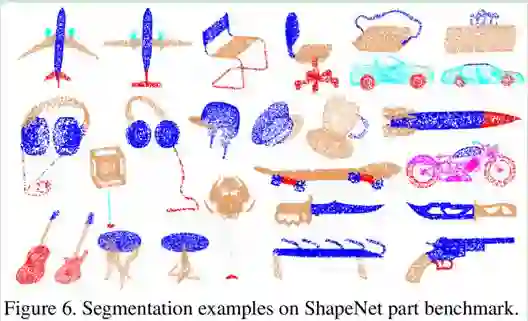 ShapeNet part 上的分割效果如图 6 所示。尽管点云所形成的形状多种多样,并且很容易产生混淆,RS-CNN 依然可以准确地将部件分割出来。