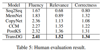 表5列出了人类评估的结果,这表明TransDG倾向于在人类注释方面产生更适当的信息,即由TransDG生成的响应比其他模型具有更高的知识相关性,表明TransDG可有效地整合适当的常识知识。