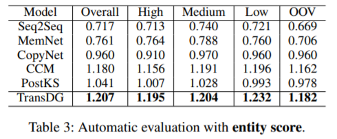 下表3证明,利用外部知识的模型在生成有意义的实体词和不同响应方面比标准Seq2Seq模型具有更好的性能,尤其是论文的模型以最高的实体得分明显优于所有基线。这验证了从KBQA任务迁移知识以进行事实知识选择的有效性。