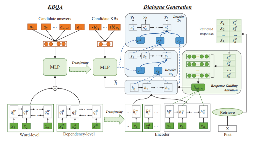 给定一个语句X = {x1, . . . , xn},对话生成的目标是生成一个适当的响应Y = {y1, . . . , ym},其中n和m分别表示语句和响应回答的长度。如模型图所示,对话生成模型从KBQA任务中传输知识,从而促进知识级别的对话理解和KB事实选择。