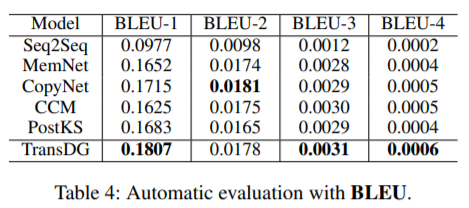 表4中显示的BLEU值表明了字级重叠的比较结果。