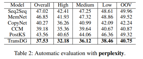 如下表2所示,TransDG在所有数据集上都实现了最低的困惑度,表明生成的响应更具语法性。