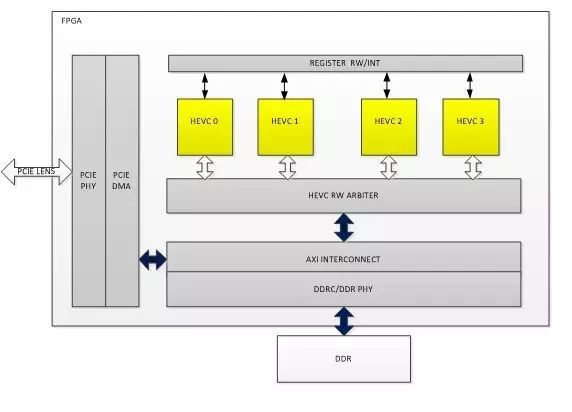 FPGA的逻辑架构主要包括平台部分和HEVC编码器IP部分,其中FPGA平台主要包括PCIE DMA以及DDR总线相关逻辑,这部分逻辑主要实现和host CPU的数据通信以及和FPGA板卡上的DDR通信。如图7所示,FPGA架构上实例化了4个HEVC core(具体几个是和FPGA资源有关),每一个HEVC core完成HEVC编码算法的完整处理,这里4核心并行工作,也就是同一时刻,4个编码任务可以并行工作,同时输出4条HEVC码流。