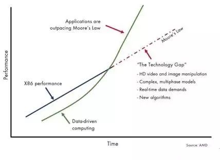 一方面处理器性能再无法按照摩尔定律进行增长,另一方面数据增长对计算性能要求超过了按“摩尔定律”增长的速度。处理器本身无法满足高性能计算(HPC:High Performance Compute)应用软件的性能需求,导致需求和性能之间出现了缺口(参见图2)。