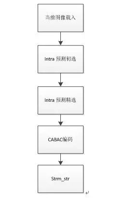 FPGA HEVC core内部算法处理流程如图8所示:分为当前图像载入,intra预测初选,intra预测精选,CABAC编码,码流输出。