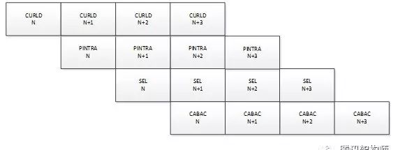 那么如何设计HEVC core实现算法功能呢?这里,编码器模块流水线设计成四级流水,如图9所示,四级流水CURLD/PINTRA/SEL/CABAC处理性能设计接近,并行起来后,平均处理每个LCU需要8400个周期,如果按照1080p图片一共510个LCU计算,单核理论上编码可以达到编46 帧/s (FPGA电路实现频率200M),这样4核并行能达到184帧/s。