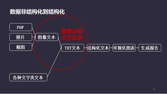 接下来我们探讨技术和落地场景的结合。我们并不缺少金融信息,却很难获得想要的数据,它们隐含在网上,可用性比较复杂,需要从非结构化变成结构化,如用算法把PDF、照片、表格等还原成文本数据,目前主流的解决办法是先把PDF变成图像,然后对该图像做解析,在图像里面获得所需要的文字或表格。