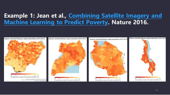 应用场景有很多。第一个例子,我们假设在非洲国家买国债。非洲国家的宏观经济数据或不披露,或存在报假情况,很难找到明确的指标,我们可以应用人工智能,比如大量的卫星云图的图像,2016年《Nature》里的相关文章指出这个国家的GDP、国情、人民生活水平甚至和晚上这个国家灯火的亮度有一定关系,我们可以把类似的情况落地,对它的GDP、CPI做宏观分析。