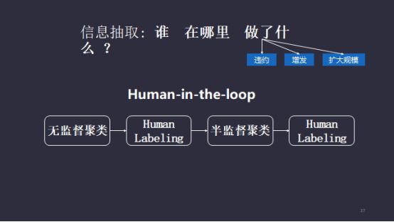 从算法的层面,我们要抽取谁在哪里、做了什么。背后的算法相对复杂,原因就在于“做了什么”,人们可以做的事情非常多,难以在基于学习或者监督学习的体系框架内把这些不同类别的事件聚类。