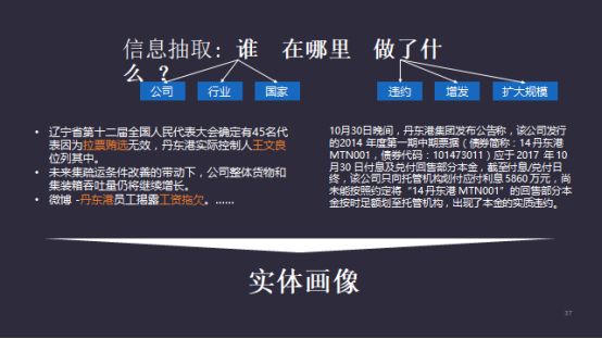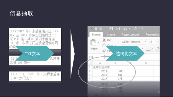利用信息抽取的办法,我们可以把不可用的信息变得可用。用一个简单直观的算法直接把文本信息变成结构化的数据,比如,通过模型或算法就能自动地反馈出来想要的某些金融的数据指标。