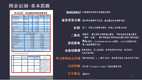 其中涉及大量的图表和文字的识别。举一个例子,将PDF中的表格转化为Excel形式。从图像处理的角度,第一步,把PDF转成图像,先把像表格的地方抽取出来。第二步,获取到该区域之后,把图像裁出来,再用图像处理。要把表格的位置从PDF里面裁出来,还是一个比较复杂的过程,需要标注很多的数据,比如这个表格的上下文。