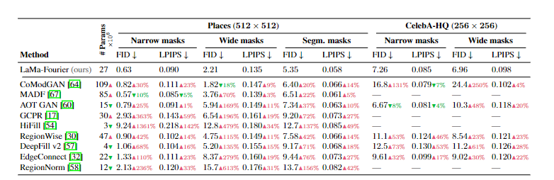 研究人员在CelebA-HQ数据集上的图像修复进行了实验,采用可学习感知图像斑块相似性(LPIP)和FID作为定量评估指标。与LaMa傅立叶模型相比,几乎所有的模型的性能都更弱(红色上箭头)。表中还包括了不同的测试掩码生成的不同策略的度量,即窄掩码(narrow)、宽掩码(wide)和分段掩码(segmentation),LaMa傅里叶的性能仍然更强,表明了实验方法更有效地利用了可训练参数。