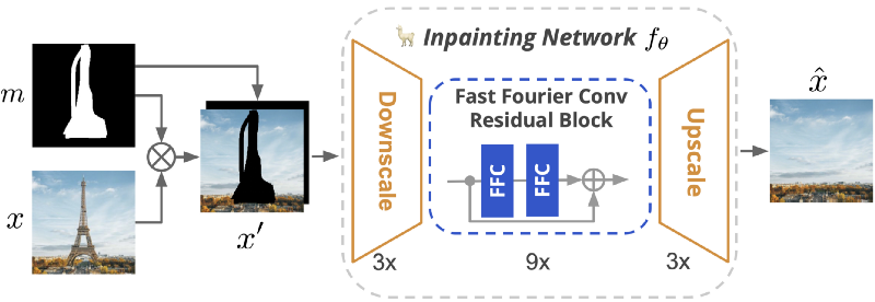 和一般的图像修复网络一样,LaMa也必须理解图像并尝试填充它认为最适合的像素。因此,在这种情况下,为了减少计算,它也需要在网络的开始阶段缩小图像。但不一样的是,LaMa在处理图像时采用了一些特别的技术来保证降采样后的图像质量和原始高分辨率图像相同。
