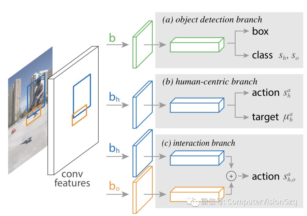 我们将学习人-对象交互作为一个多任务学习问题:上图所示的所有三个分支都是联合训练的。