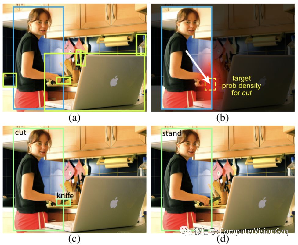 于是,将这一思想作为一个以人为中心的识别分支在Fast R-CNN框架中实现。具体来说,在与人相关的感兴趣区域(ROI)上,该分支对动作的目标对象位置执行动作分类和密度估计。密度估计器预测每种行为类型的四维高斯分布,它模拟目标对象与人的可能相对位置。这种预测完全基于人类的外表。