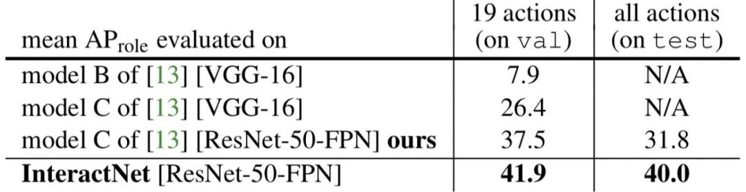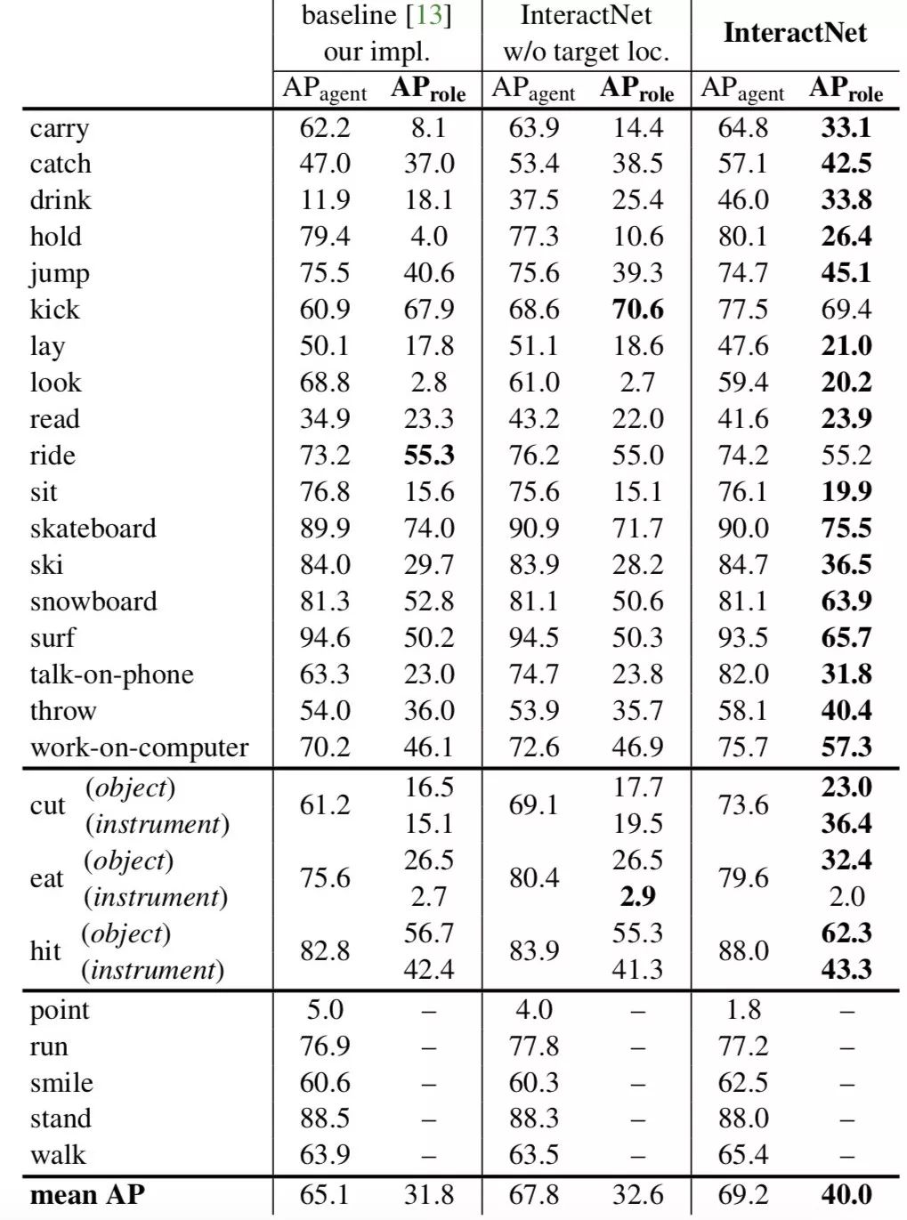 V-COCO试验的详细结果。为每个动作显示两个主要基线和InteractNet。在[13]中定义了26个动作,由于3个动作(cut, eat, hit)涉及两种目标对象(instrument and direct object),因此有26项。在AProle上大胆地展示了领先的项。
