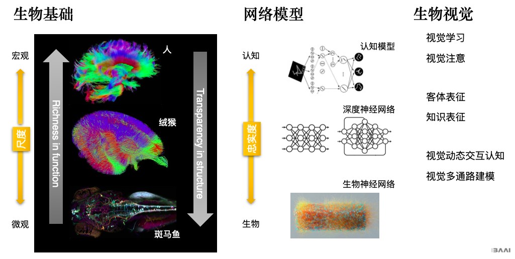 再往高级一点走,我们现在准备做绒猴的大脑精细结构。狨猴大概有10亿量级的神经元。针对绒猴,我们首先可以用磁共振看它的整个大脑是怎么活动的;然后用钙成像,看它某个区域是怎么活跃的;然后用双光子成像,去看神经元层面上是怎么活动的。从这三个层面,我们可以把整个大脑、脑功能区一级神经元层面完整地重构出来。我们会基于这些数据建立一个生物智能的开源开放平台,所有数据可以开放使用。我们可以从这些数据中去了解狨猴是怎么识别一个物体、怎么快速反应等智能的本质。