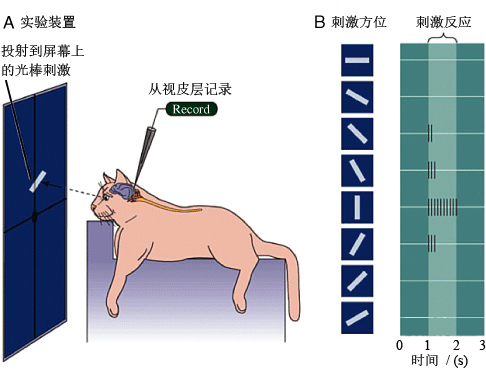 此外,他们还做了一系列关于猫的实验。例如在猫刚生下来的时候,把它的眼睛缝上,完全不给它看任何刺激,过一段时间后,再打开它的眼睛,这个时候再记录它大脑的神经元会有什么样的反应;猫出生后,只给它看横条,一直不让它看竖条,然后记录它的神经元会有什么反应等。这种方式叫做“单细胞记录”,现在的神经电生理研究还在用这种方法。