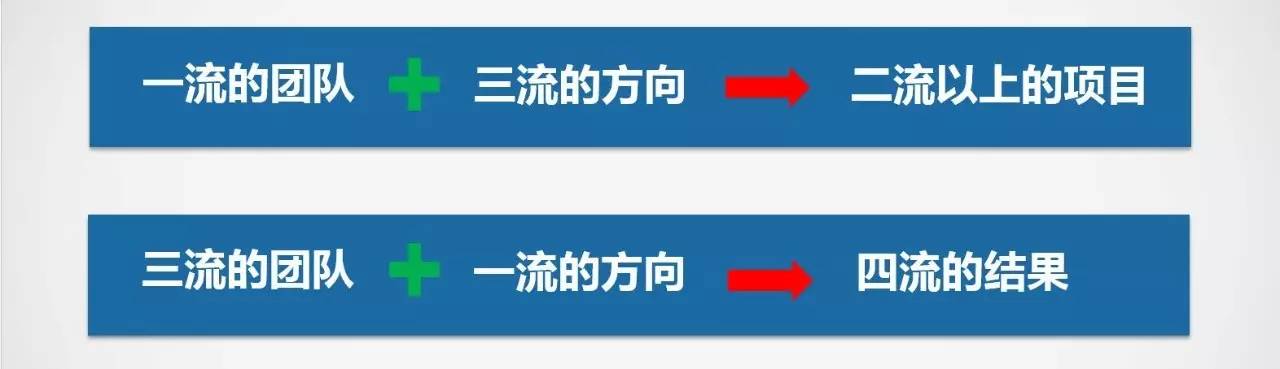一流的团队遇到三流的方向也能做出二流以上的项目。三流的团队遇到一流的方向,包括一流的资源与充足的资金,最后也只能得到四流的结果。创投行业里四流的项目很多,它们融了很多钱,拿到了很多优秀的资源,但是依旧没有成功,问题就在于团队。