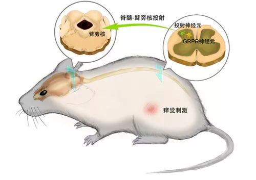 图片说明:痒觉信息从脊髓到大脑传递通路示意图。脊髓中介导痒觉信息的 GRPR 神经元通过兴奋性突触将痒觉信息传递给脊髓投射神经元,再由这些兴奋性投射神经元传递到臂旁核脑区。