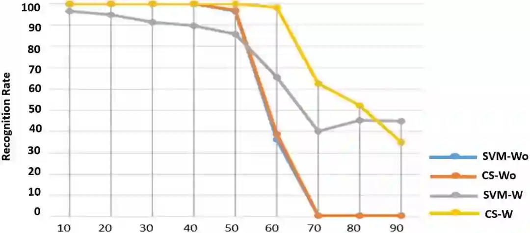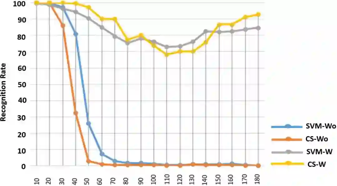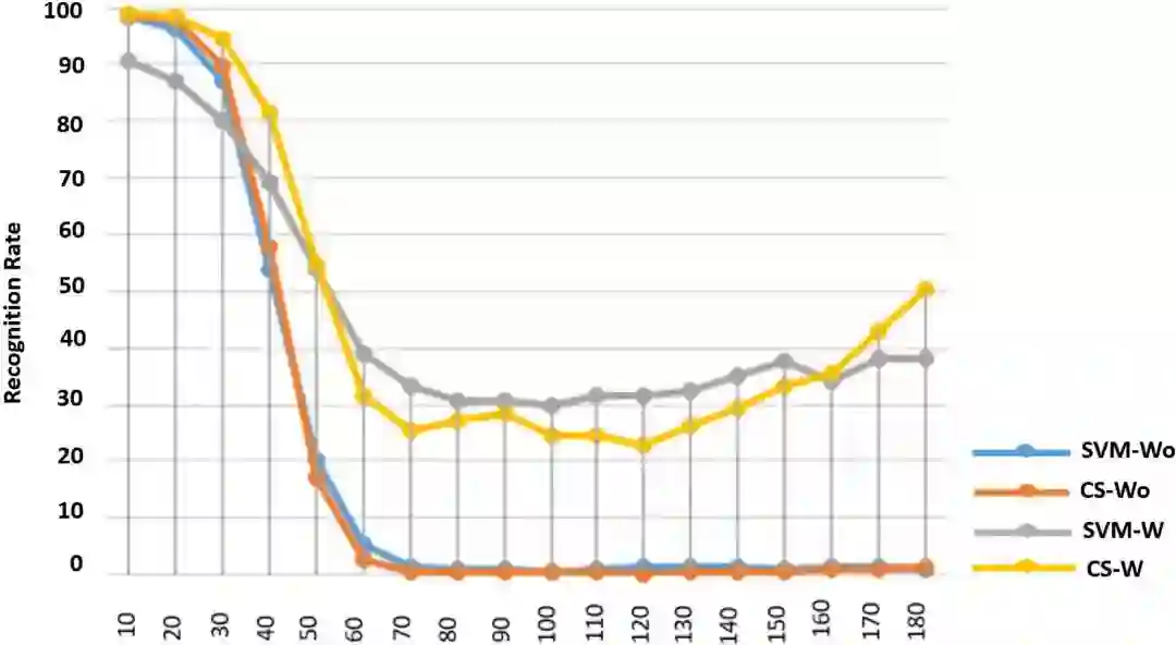 在每种情况下,使用两个分类器进行了14个涉及部分,旋转和缩小人脸的子实验。出于训练目的,使用了每个受试者70%的图像,这些图像也通过诸如填充和翻转之类的操作来增强。在每种情况下,剩余的30%的图像用于测试。
