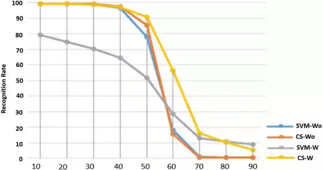 在FEI数据库中使用基于面部部分的SVM和CS分类器的面部识别率 - 在训练中不使用/使用面部的面部部分