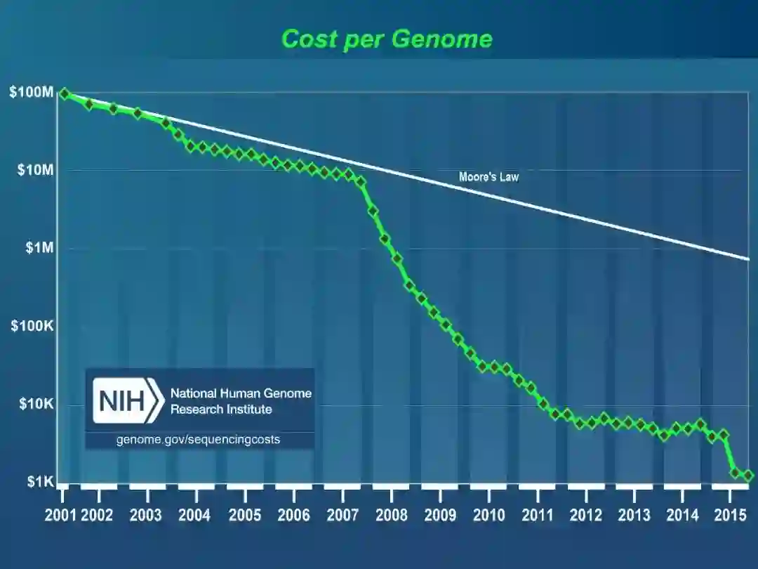 ▲基因组测序成本的降低速度要超过摩尔定律(图片来源:NIH)