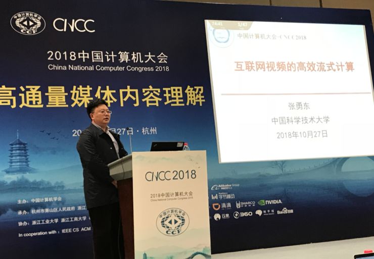中国科学技术大学张勇东教授是第一位上台演讲的嘉宾,他的演讲主题为《互联网视频的高效流式计算》。