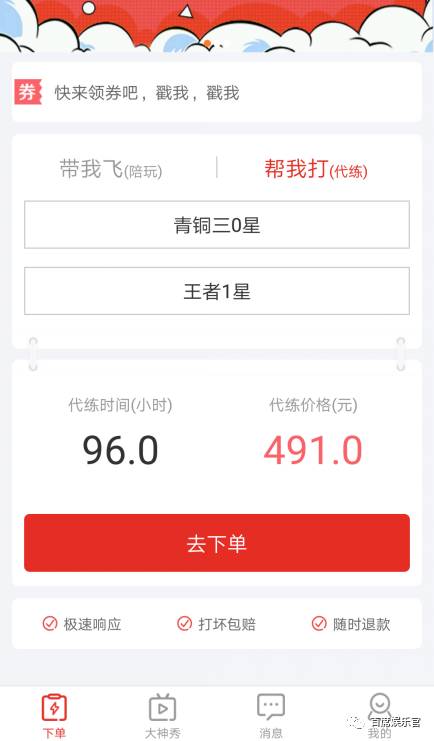 小官又选择了从黄金到铂金段位的“帮我打”,价格显示为42.5元,到钻石段位为90.5元,到星耀段位为220.5元。可看出,在专门的代练APP内,代练价格是稍高于上文提到的淘宝店铺价格的。
