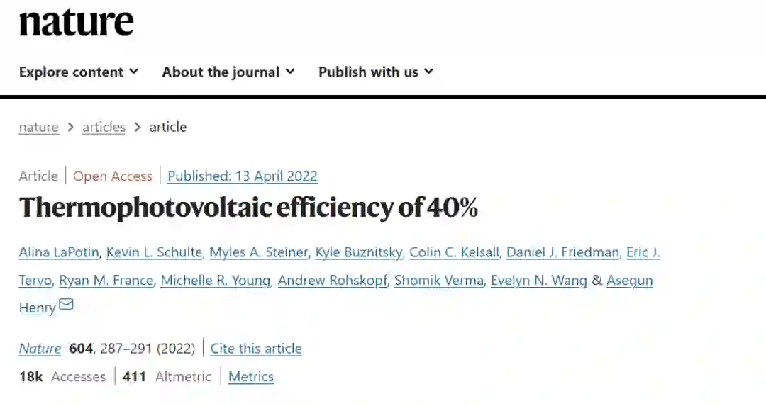 麻省理工学院(MIT)和美国国家可再生能源实验室 (NREL) 设计出一种新的热光伏 (TPV) 电池,能以超过 40% 的效率将热能转化为电能,优于传统蒸汽轮机。该研究登上了 Nature。