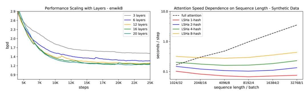 图 5 左:在 enwik8 上 LSH 注意力随层数增加的性能变化曲线;图 5 右:全注意力和 LSH 注意力的评估速度呈现出不同的曲线变化。