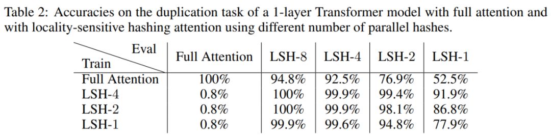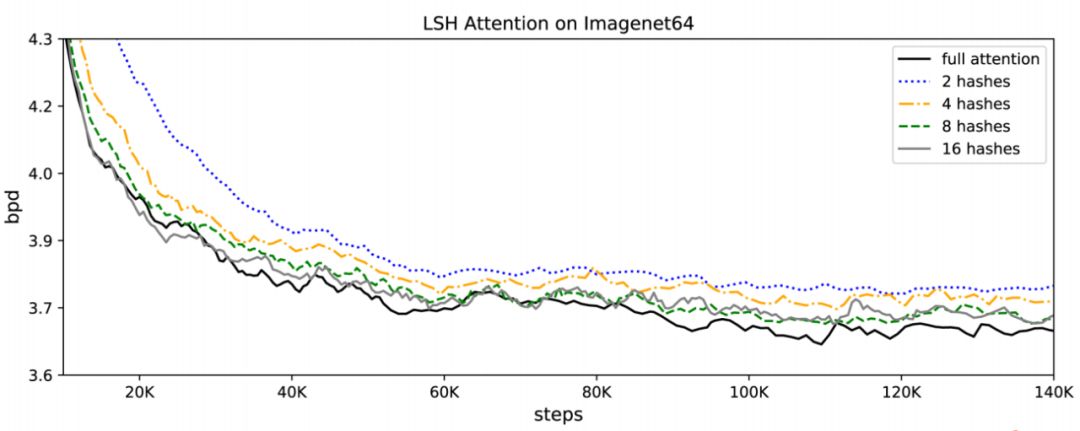 如下图 4 所证,LSH 注意力是全注意力的近似值,它的准确率随着哈希值的增加而提升。当哈希值为 8 时,LSH 注意力几乎等同于全注意力。一般而言,模型的计算开销随哈希值的增加而增大,所以研究者可以根据自身计算预算调整哈希值。