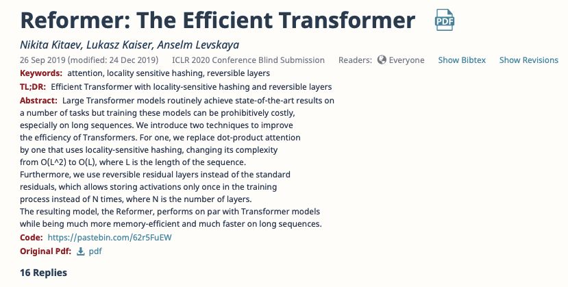 基于局部敏感哈希(locality-sensitive hashing,LSH)的近似注意力计算,让注意力层的 O(L2) 因子替代 O(L) 因子,实现在长序列上的操作。