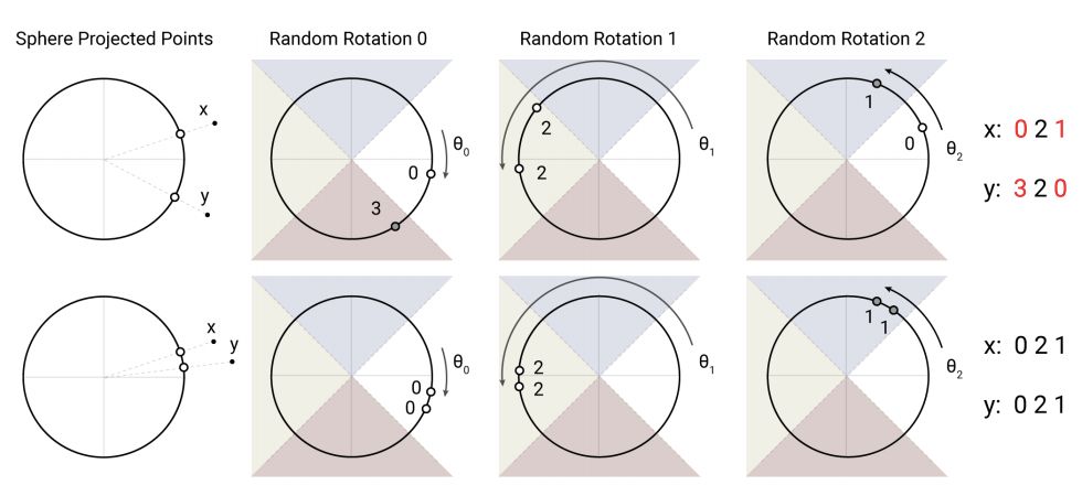 图 1:研究中使用的局部敏感哈希算法。这种算法使用随机旋转的方法,对投影的点建立分块,建立的规则依据对给定轴的投影进行比较。在本图中,两个点 x、y 由于三次随机旋转投影中的两次都不靠近,所以不太可能有相同的哈希值。而另一个例子中他们投影后都在同一个。