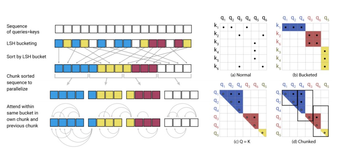图 2:简化的局部敏感哈希注意力,展示了 hash-bucketing、排序和分块步骤,并最终实现注意力机制。