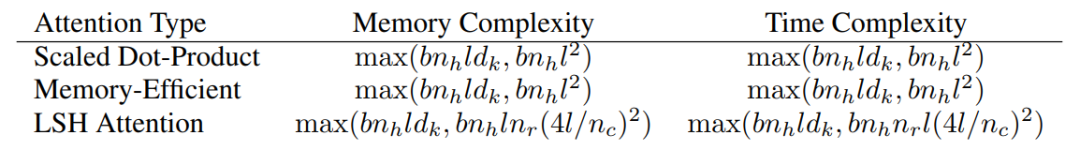 表 1:Scaled Dot-Product、Memory-Efficient 与 LSH 注意力的内存和复杂度对比。l 表示长度,b 表示批量大小,n_h 表示 head 数量,n_c 表示 LSH 块数量,n_r 表示哈希重复次数。