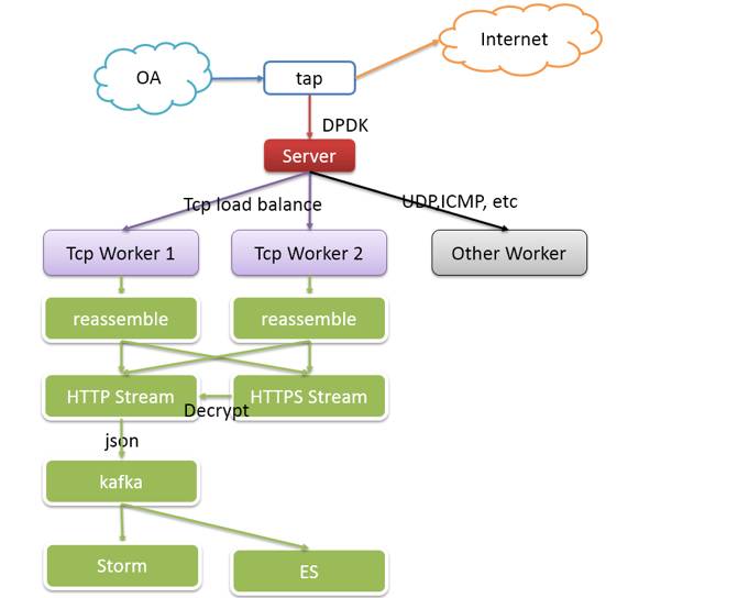 基于网络流量镜像的方式中,需要在办公网到测试环境核心交换机上做流量镜像,通过 dpdk、pf_ring 等高速抓包模块进行流量获取,并按照五元组信息进行 TCP 流重组。然后通过 HTTP 解析器,将其中 HTTP 请求的请求方法、请求地址、请求域名、请求参数等数据提取成 JSON 格式,发送到 Kafka 中。