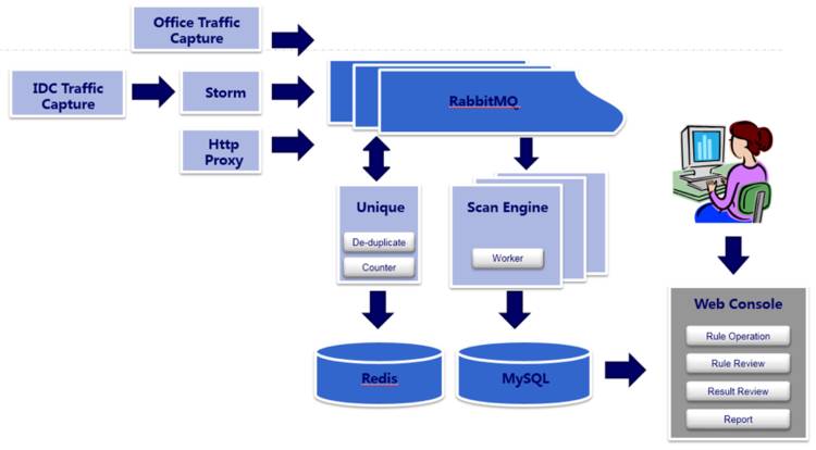 基于以上自动化的安全检测需求,由我们内部研发了 Hulk 项目,通过网络流量镜像等方式来实现分布式的实时 Web 漏洞扫描系统。整个项目按模块可分为数据源,数据处理,漏洞检测,漏洞管理等几大模块。