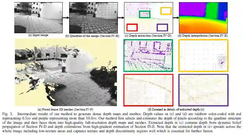 利用强度图片的四叉树结构,在多分辨率上估计深度图来减少计算负担。本文提出基于四叉树的像素选择和动态置信传播来加速建图过程:被选择的像素根据其在四叉树的水平,用其对应的计算资源来进行深度优化。