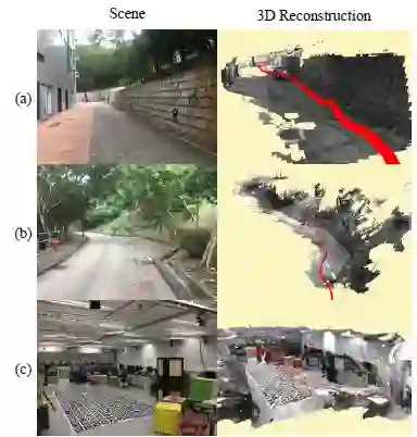 图1:提出的方法在单目视觉惯导系统状态估计下实时生成的稠密3D地图。左为输入图片,右边为实时构建的3D地图,红线为相机轨迹。