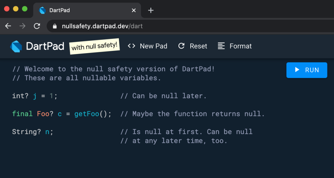 // 在空安全的 Dart 中,下列变量皆不可空。var i = 42;final b = Foo();String m = '';