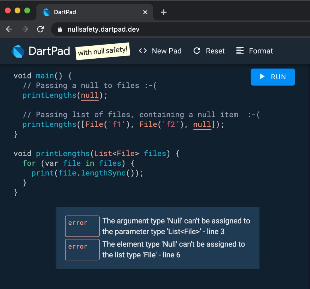 Dart 会确保您永远无法将空值赋予上述任何一个变量,如果您试图在一千行代码之后输入 "i = null",就会触发静态分析错误并看到红色的波浪下划线,程序也将无法编译。