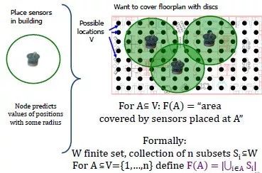 这件事有点太抽象,我们举一个具体的问题,这样大家就会有很直观理解。假设,现在有一个房间,我们需要在房间里布置一些传感器,布置传感器是为了对整个房间进行数据采样。每个每个传感器会有一个覆盖面积。我们希望放上有限的传感器,覆盖的面积越大越好。在这样一个问题里边,对于任何一个集合,F(A)=A能够覆盖的面积。所谓的A是什么呢?就是你放的传感器,因为每个传感器会放在一个位置上。