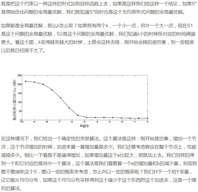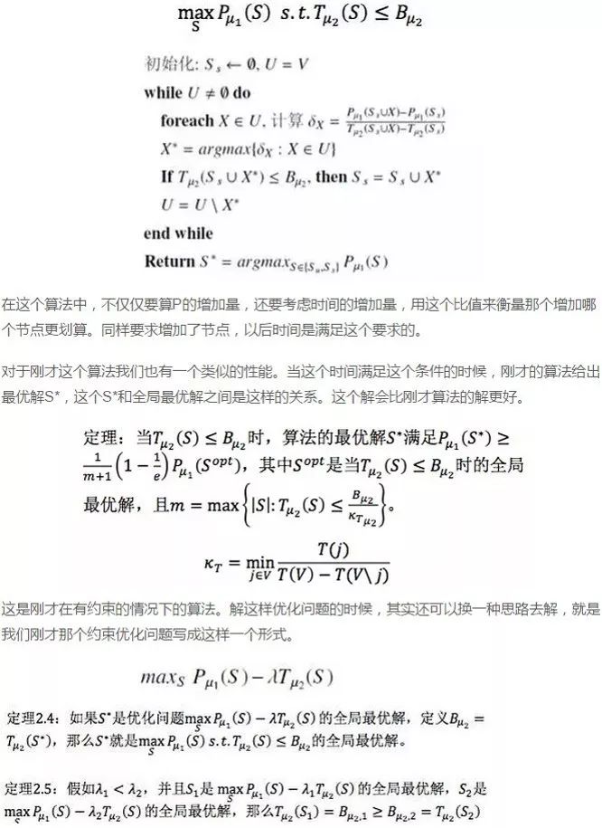 这个问题里的F是一个子模函数(我定义F是它覆盖的那个面积)。为什么呢?可以设想,我有两种情况,一种情况是我放2个传感器,还有一种情况是,我放4个传感器,其中包含了刚才的两个传感器。我在2和4个传感器的布局里,分别再加上同一个位置的1个传感器,那么你会发现上面小的集合情况(2个传感器)下带来的面积增加量比较大。而原来4个传感器的集合增加的面积部分比较小。这是一个非常直观的例子。