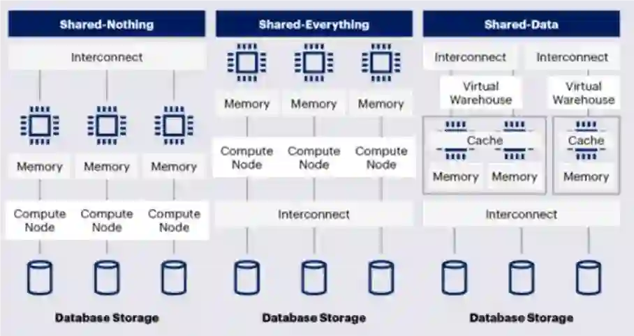 第二种 Shared-Data 架构是 MPP 架构的演进,通过计算与存储系统解耦(即存储计算分离),存储完全做成一个独立的池化形态,不仅做到了存储器的分离,还做到存储的共享。它解决了 MPP 架构耦合导致的扩展性问题,因而得到广泛欢迎,Snowflake 是其中的代表。