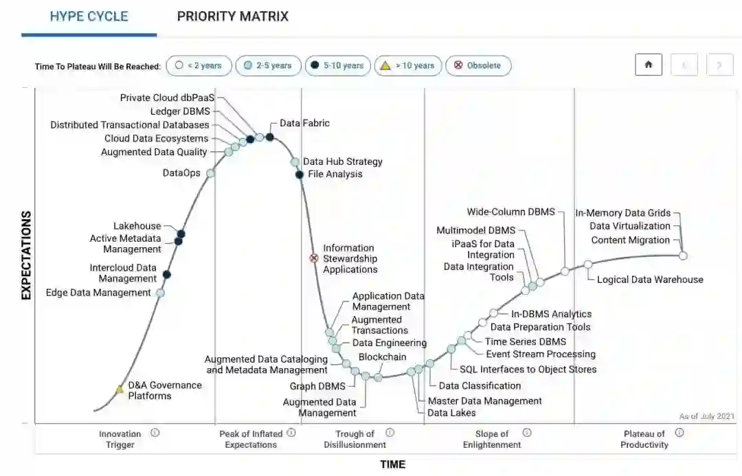 (图:Gartner Hype Cycle mode / Reference: Hype Cycle for Data Management 2021)