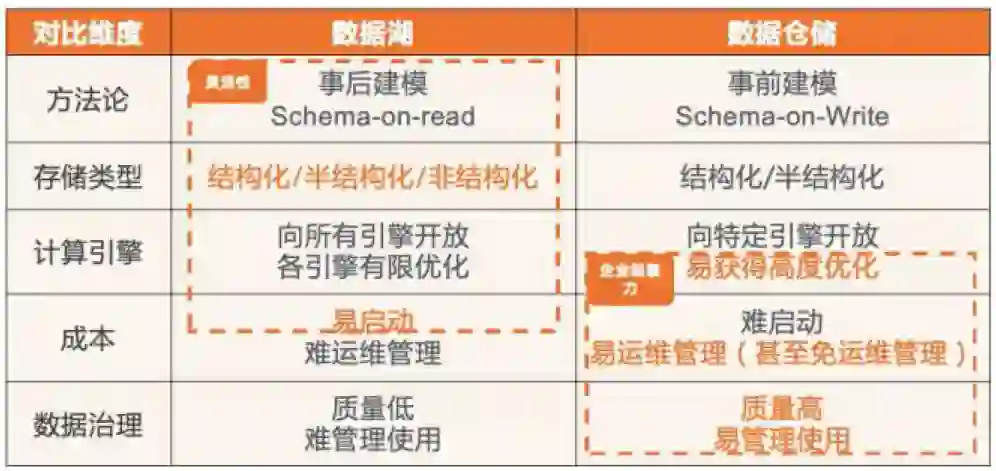 这里稍微介绍一下两种设计的不同,上图按照 5 个维度对比了数据湖和数据仓库体系。